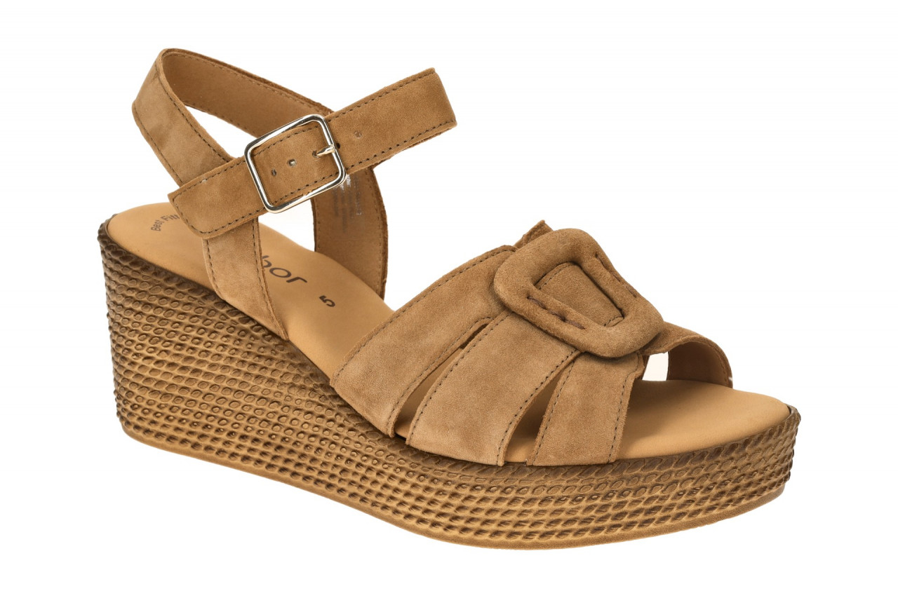 Hersteller: Gabor Hersteller Art-Nr.: 64.772.14 Modellname: 64.772 – GABOR BEST FITTING Machart: Damen Sandalette – Riemchen Sandalen, Wedges Farbe: braun + Sohle in braun + dunkel schattiert (walnut) Obermaterial: Echtleder – Velour – Rauhleder (Samtchevreau) Innenfutter: Echtleder Innensohle: Echtleder – Fu?bett Wechselfu?bett: nicht herausnehmbare Innensohle Laufsohle: Polyurethan (PU) – extra leicht und flexibel, Plateau ca. 3cm, Riffelmuster, Wellfeet Light Verschluss: Klettverschluss + Steckschnalle Absatzart: Keilabsatz / Wedge, Keil ca. 4cm Absatzh?he: flach Schuhform: rund Gr??enhinweis: f?llt normal aus Weitenangabe: F – normal Weite Herstellerinformationen Gabor Shoes GmbH | Joachim-Gabor-Platz 1, 83024 Rosenheim Kontakt: info@gabor.de | 0049 8031 801-0 interne Artikelnummer f?r Ihre R?ckfragen: 289-30-0025