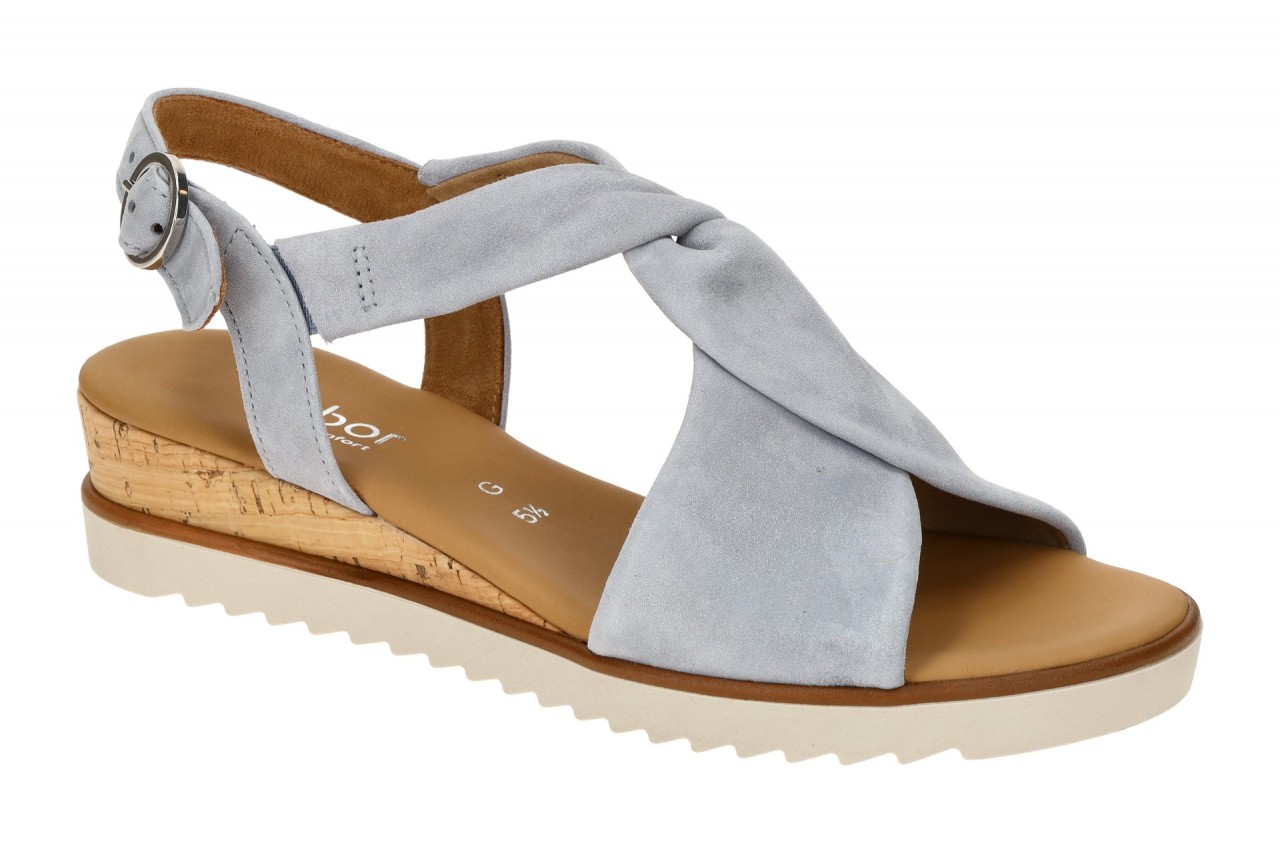 Hersteller: Gabor Hersteller Art-Nr.: 62.751.16 Modellname: GENUA – Gabor comfort Machart: Damen Sandalette – Riemchen Sandalen, T-Steg Sandale Farbe: hellblau + braun + creme-wei? (azur (Kork/creme)) Obermaterial: Echtleder – Velour – Rauhleder (Drill (LDS) – Glitzer) Innenfutter: Textil – weich gepolstert Innensohle: Echtleder Komfort Fu?bett Wechselfu?bett: nicht herausnehmbare Innensohle Laufsohle: Gummisohle Verschluss: Schnalle Absatzart: Keilabsatz / Wedge, Keil ca. 2,5cm, nachhaltiger Kork Absatzh?he: flach Schuhform: rund Gr??enhinweis: f?llt normal aus Weitenangabe: G – normal Weite Herstellerinformationen Gabor Shoes GmbH | Joachim-Gabor-Platz 1, 83024 Rosenheim Kontakt: info@gabor.de | 0049 8031 801-0 interne Artikelnummer f?r Ihre R?ckfragen: 288-86-0013