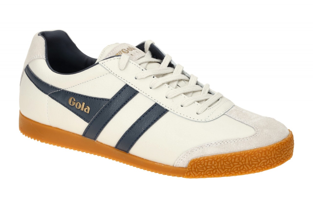 Hersteller: Gola Hersteller Art-Nr.: CMB426AE Modellname: HARRIER LEATHER Machart: Herrenschuhe – Sneakers – Halbschuhe Farbe: wei? (kein Reinwei?) + dunkelblau + Sohle in braun (offwhite/navy/navy) Obermaterial: Glattleder + Velourleder Mix Innenfutter: Textil und Synthetik, Kunstleder Innensohle: Textil Fu?bett Wechselfu?bett: Ja – herausnehmbare Innensohle Laufsohle: Gummisohle Verschluss: 6fach Schn?rung Absatzart: flach – kein Absatz Schuhform: rund Gr??enhinweis: f?llt normal aus Weitenangabe: G – normal Weite Herstellerinformationen Gola Sportswear GmbH | Am Sandtorkai 70, 20457 Hamburg Kontakt: customerenquiries@gola.co.uk interne Artikelnummer f?r Ihre R?ckfragen: 134-12-0002